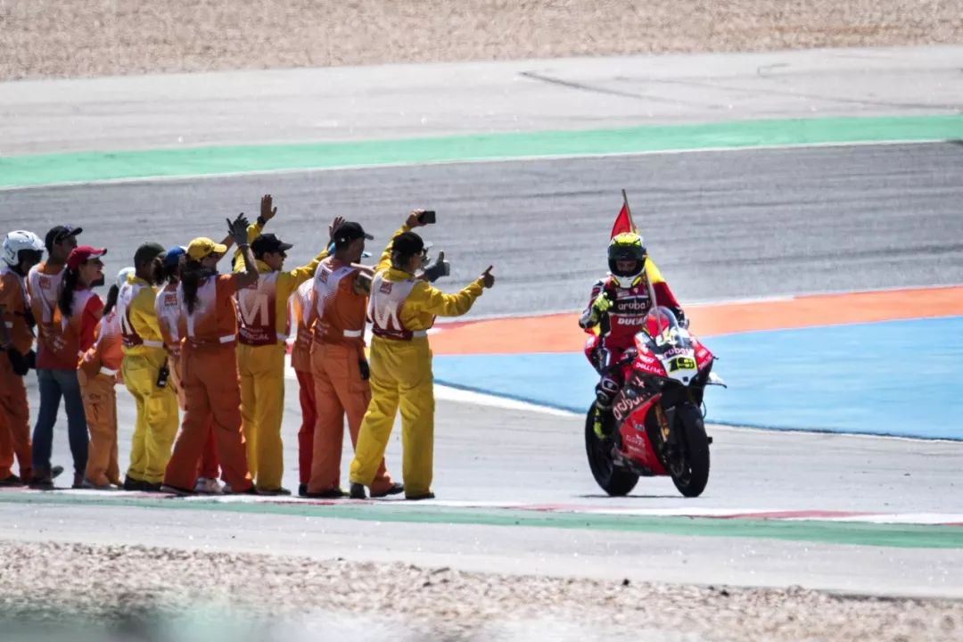 Ducati 的捌弟(Alvaro Bautista,巴迪斯塔)盡管經歷了一個糟糕的起步、被擠到了第六,但他很快就開始發力,到第 1 圈結束時,他先是在大直路的尾段超越了馬克,兩圈之后又扒過了洛維斯。卷土重來的勢頭還在繼續,又過了一圈之后、他上升到了第三位。到第六圈,捌弟進占首位、并保持著高速快放的狀態,試圖進一步拉開與后車的距離。
