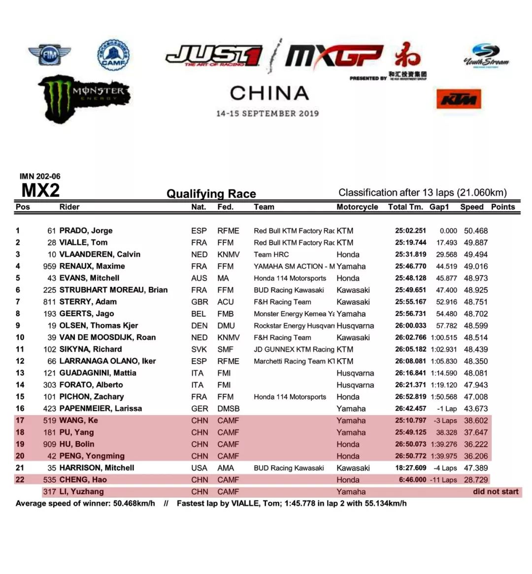 有十位中國車手(MXGP 級別三位、MX2 級別七位)以外卡身份、報名參加本站的比賽。在今天舉行的預選賽,有九位中國車手出賽(MXGP級別三位、MX2 級別六位)。
