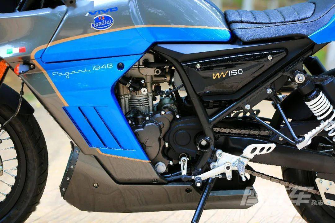 由于 PAGANI150采用CR150相同平臺(tái),所以兩車在硬件配置上有著諸多相同之處。搭載了排量149mL的單缸水冷4氣門DOHC發(fā)動(dòng)機(jī),壓縮比12:1,缸徑×行程為63.6mm×47mm。最大功率為13.3kW(9750r/min),最大扭矩14N·m(7500r/min),動(dòng)力性能在150級(jí)別中仍是佼佼者,高轉(zhuǎn)機(jī)的出力特性契合 Café Racer的賽車風(fēng)格,不過(guò)高轉(zhuǎn)機(jī)的駕駛方式有所不同,能否習(xí)慣還要看個(gè)人的駕駛風(fēng)格。