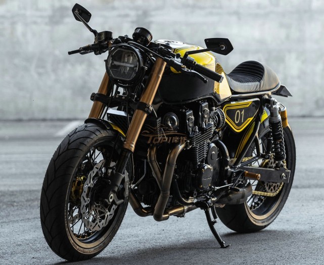 七十年代的本田CBcaféracer,由葡萄牙人深度打造,以1996 Seven-Fifty為靈感。采用GSX-R的前叉、Öhlins的后減震,17英寸Kineo輻條輪輞,皮革駝峰咖啡座墊,黑色和金色搭配的漆面,充滿復(fù)古感和未來感!