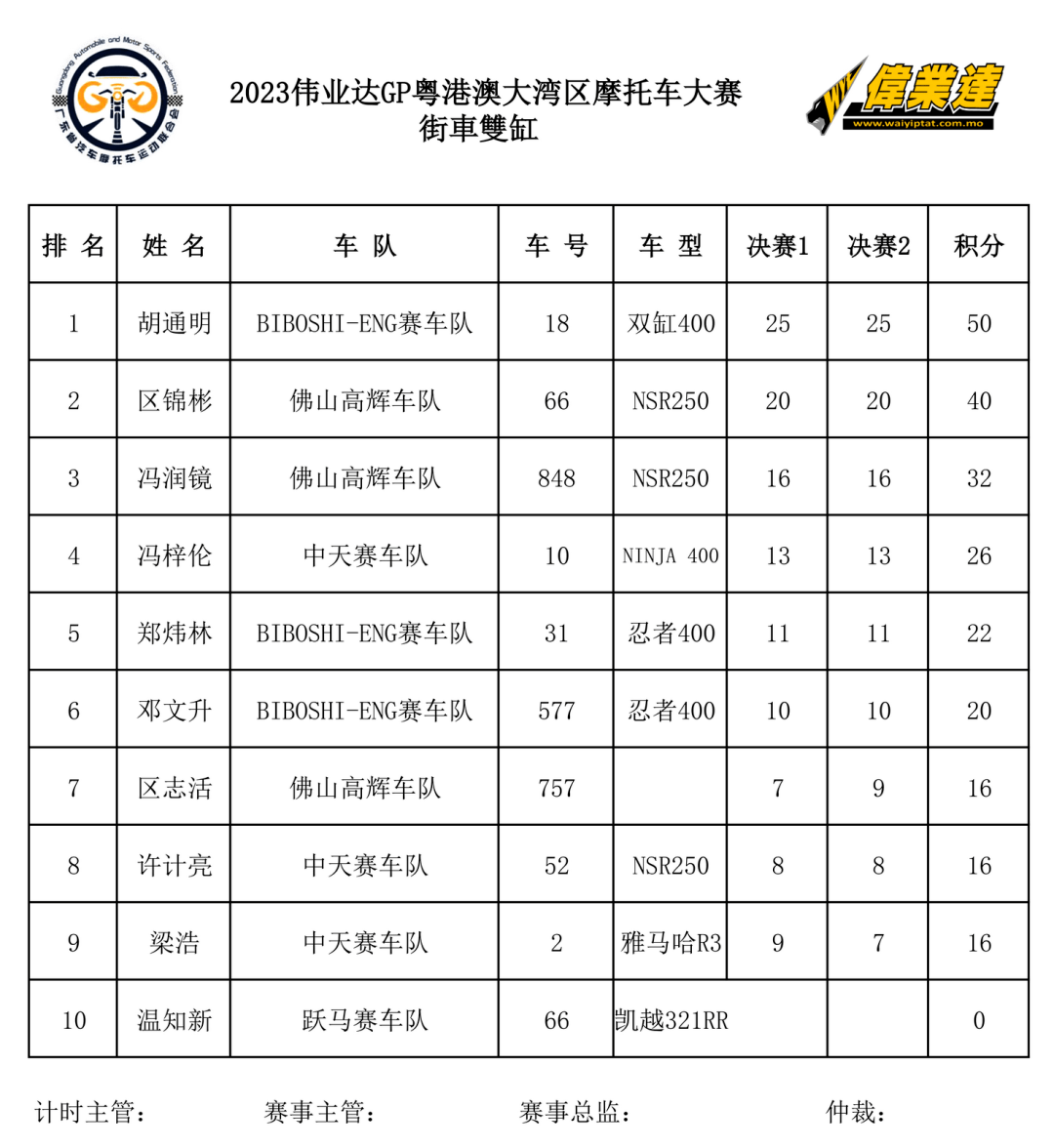注 1:根據已結束的四個回合比賽(三站三水、一站恩平)計算積分;