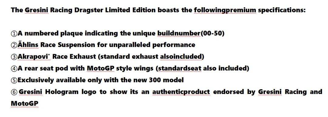 為了讓機(jī)車愛好者更好地體驗ITALJET的魅力,戶外設(shè)置了試駕區(qū)域,參與者們可以直面感受“貼地飛行”的激情與速度。啟動引擎,強(qiáng)勁的動力輸出讓人熱血沸騰,而精準(zhǔn)的操控性則讓駕駛者能夠輕松駕馭每一個彎道。在加速過程中,DRAGSTER 150表現(xiàn)出了出色的穩(wěn)定性和響應(yīng)速度,讓人充分體驗到了城市賽車的激情與樂趣。無論是穿梭于城市街道還是挑戰(zhàn)賽道,DRAGSTER 150都能給人帶來極致的駕駛體驗。此外,ITALJET 還推出了一系列驚喜周邊,作為摩圈“最靚的機(jī)車”,布袋直接水靈靈得把“顯眼包”印上去了,限量鑰匙扣、貼紙等直接薅,年輕人喜聞樂見的文化也是被玩明白了。在此次重慶摩展上,ITALJET不僅推出了備受矚目的DRAGSTER 150,還驚艷亮相了DRAGSTER 300 Gresini Racing賽道新版畫,這一舉措無疑成為了展會的焦點(diǎn),引發(fā)了眾多摩托車愛好者的熱烈討論。Gresini MotoGP車隊在摩托車賽事中擁有著輝煌的歷史和卓越的聲譽(yù)。他們以精湛的技術(shù)和頑強(qiáng)的拼搏精神,在賽場上屢獲佳績。2024 賽季,Gresini與共擁有10個冠軍頭銜的馬奎斯兄弟一起參加MotoGP,作為一支頂級車隊,他們對賽車的性能和技術(shù)要求極高,這也使得他們在選擇合作伙伴時格外謹(jǐn)慎。ITALJET能夠成為 Gresini MotoGP車隊的技術(shù)贊助商,充分證明了其在摩托車領(lǐng)域的實(shí)力和技術(shù)水平。在5月底MOTOGP,Gresini Racing Dragster限量版在國外首次公開揭幕,引起現(xiàn)場熱烈圍觀!異形踏板采用Gresini賽車隊的特色涂裝,亮眼的天藍(lán)色為主,還有紅色輔助,這可是93號馬奎斯今年所在車隊的配色,專為真正喜歡兩輪車和最挑剔的收藏家所開發(fā),剛上市就一車難求,充分體現(xiàn)了DRAGSTER車迷們的熱情與執(zhí)著。限量版Gresini Racing Dragster裸露在外的紅色編織車架充滿肌肉感,除了“皮膚”外,也按照馬奎斯坐騎設(shè)計了MotoGP的尾翼,賽車感瞬間加持!騎上它,馬奎斯冠軍歐氣與你同在!但這款車型僅僅展出還是后續(xù)開售官方似乎還沒有公布,想必大家最期待的部分應(yīng)該還是配置和價格!早在上半年DRAGSTER 300 Gresini Racing賽道版在國外官方的配置已公布:在售價方面,歐洲公布零售價為9499歐元(折合人民幣約75000元),與國外市場相比,國內(nèi)消費(fèi)者對DRAGSTER 300 Gresini Racing賽道版的價格敏感度較高。一些人認(rèn)為,國內(nèi)售價應(yīng)該更加親民,以吸引更多消費(fèi)者。而另一些人則認(rèn)為,考慮到該版本的獨(dú)特性和技術(shù)含量,其售價是合理的。所以應(yīng)該有很多人應(yīng)該和小編一樣覺得不會引入國內(nèi)。在配置方面,人們對其與國外版本的差異也存在不同看法。一些消費(fèi)者希望國內(nèi)版本能夠與國外版本保持一致,以確保享受到同等的高品質(zhì)配置。然而,由于市場需求、成本等因素的影響,國內(nèi)版本是不是可能會在某些配置上進(jìn)行調(diào)整?這場爭論引發(fā)了人們對摩托車市場的思考。一方面,消費(fèi)者希望能夠以合理的價格購買到心儀的產(chǎn)品,同時也期待獲得與國際市場接軌的配置。另一方面,廠商需要在滿足消費(fèi)者需求的同時,考慮成本和市場策略。DRAGSTER 300 Gresini Racing賽道新版畫的推出是ITALJET 的一次大膽嘗試,它既展現(xiàn)了品牌的創(chuàng)新精神,又引發(fā)了關(guān)于售價和配置的爭議。在未來,希望廠商能夠更好地平衡各方因素,為消費(fèi)者帶來更多優(yōu)質(zhì)的產(chǎn)品。同時,消費(fèi)者也應(yīng)該理性看待這些爭議,根據(jù)自己的需求和預(yù)算做出明智的選擇。ITALJET在2024重慶摩展上的精彩表現(xiàn),充分展示了其在摩托車領(lǐng)域的實(shí)力和魅力。未來,ITALJET將繼續(xù)推出更多優(yōu)秀的車型,為機(jī)車愛好者們帶來更多驚喜。