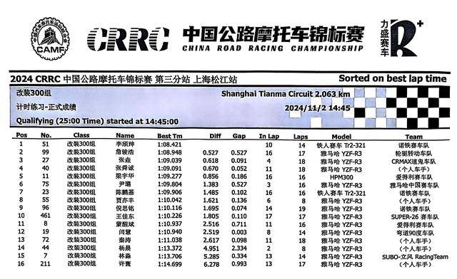 下面的圖片,2024 年度 CRRC 中國公路摩托車錦標賽第三站、上海松江站,各競賽組別在各個競賽環節的成績: