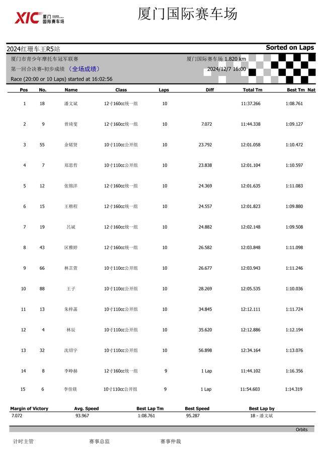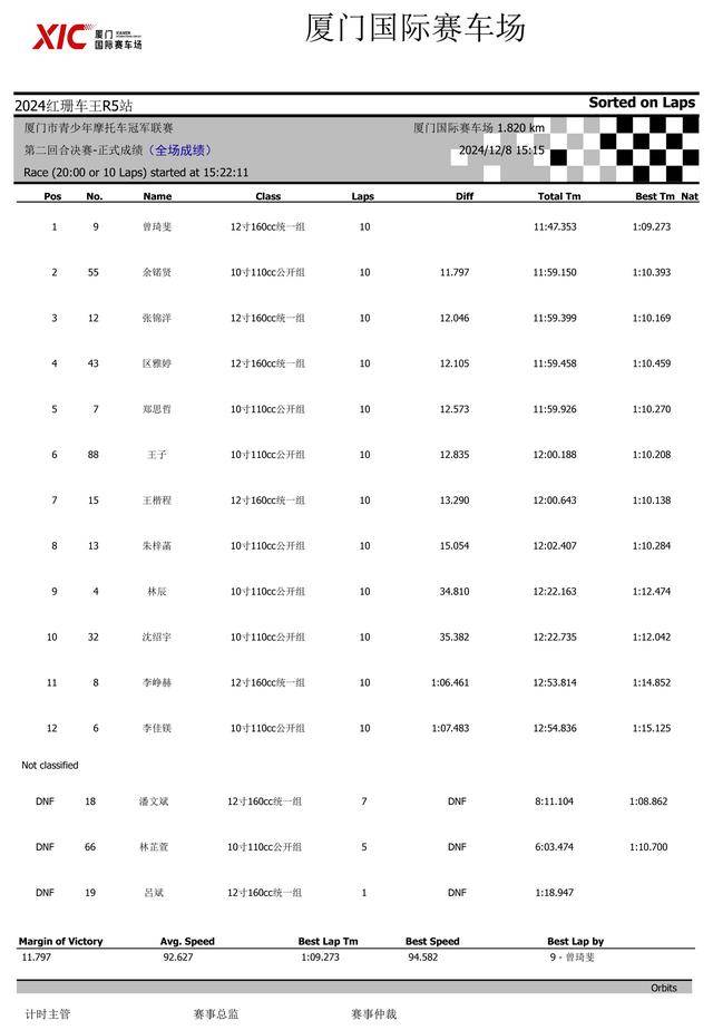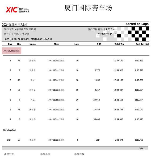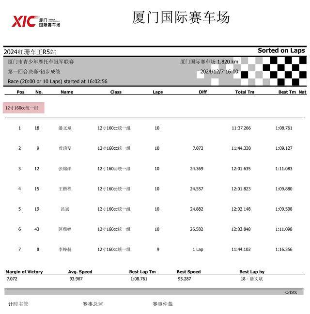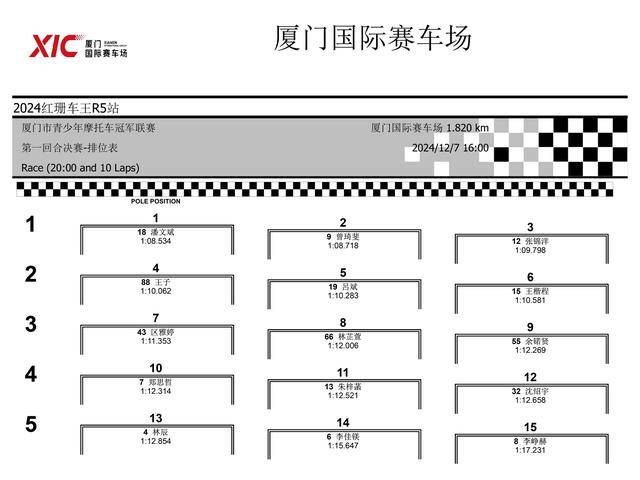 下面的圖片,2024 紅珊車王、廈門青少年摩托車冠軍聯賽第四站,排位賽以及兩節正式比賽的成績。