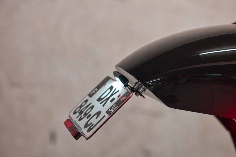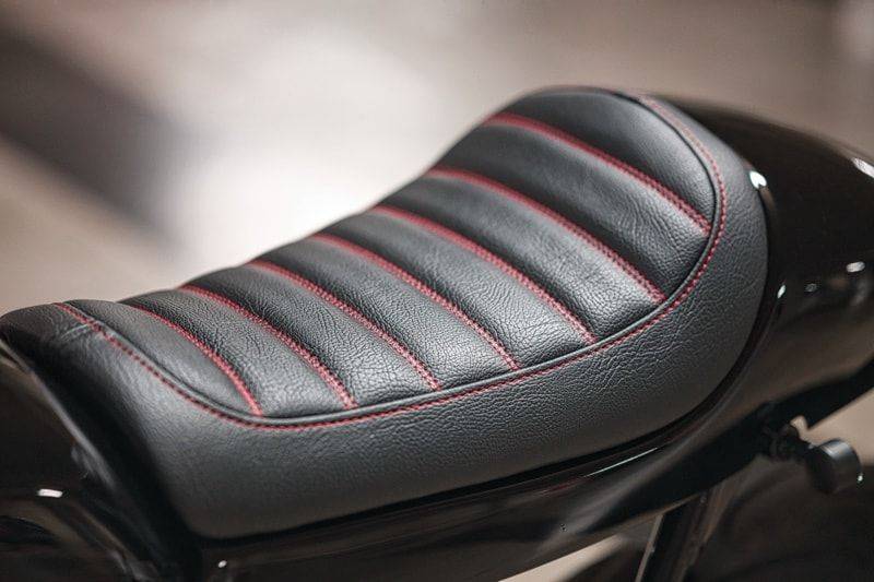 新車尾設計簡潔利落,搭配黑色皮革座墊,并以紅色縫線點綴。 車尾還安裝了一個訂制的車牌架,而后避震和進氣口則有搖臂支架的擋泥板進行保護。 前擋泥板來自Ducati Monster,而油箱則保留原廠設計,并與其他車身部件形成完美搭配。
