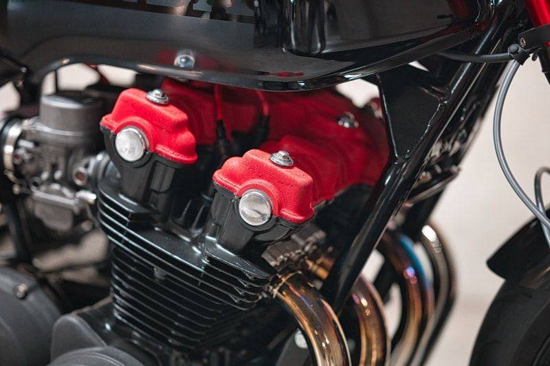 最后,這輛車最吸引眼球的莫過于其色彩搭配。 整體車身以亮黑色為主,搭配紅色點綴,讓這臺CB750 Cafe Racer展現出獨特的個性。 油箱上的本田字樣采用光面與霧面的對比設計,既低調又醒目,令人過目難忘。