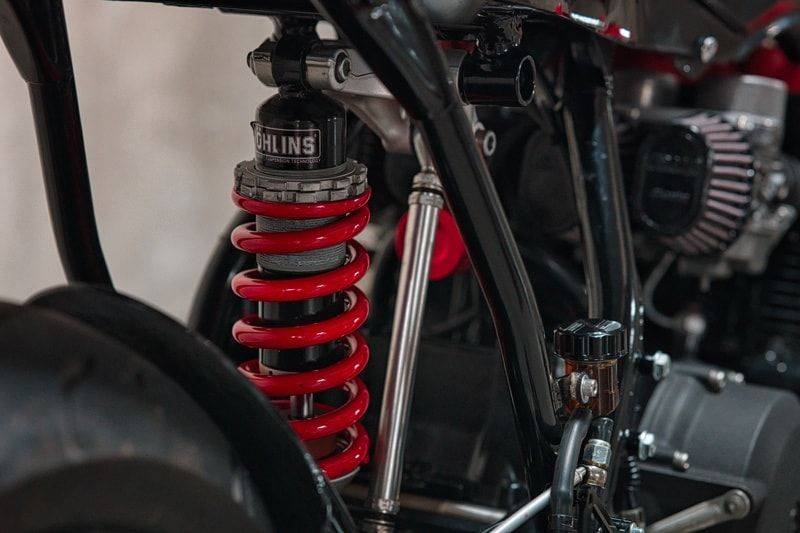 在整合這些零件時,將原本的雙避震系統轉換為單避震結構是一個極具挑戰性的任務。 每個輪圏都包覆著Dunlop高抓地力輪胎,而前制動系統則采用經過翻新與重新涂裝的Brembo卡鉗,并配有波浪型改裝制動碟盤,進一步提升制動性能。