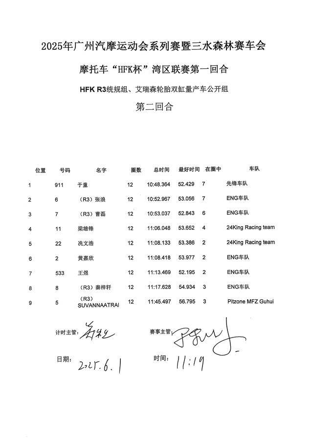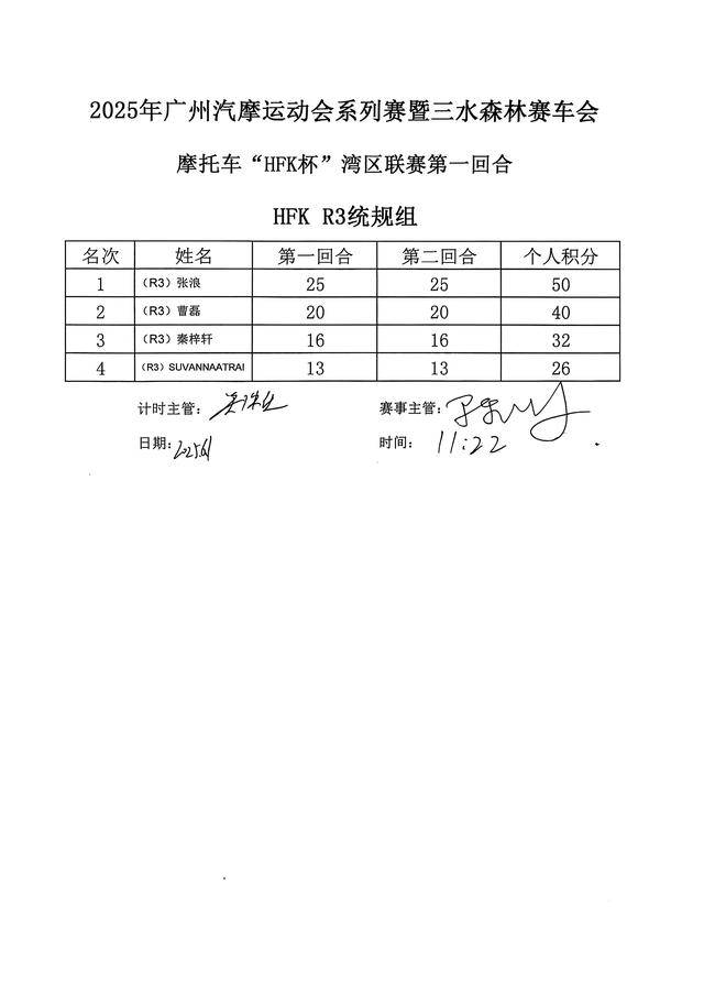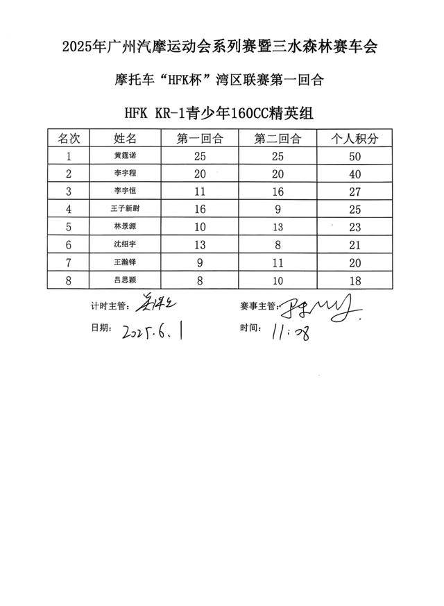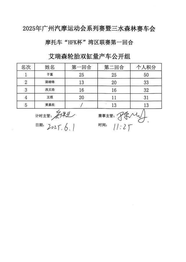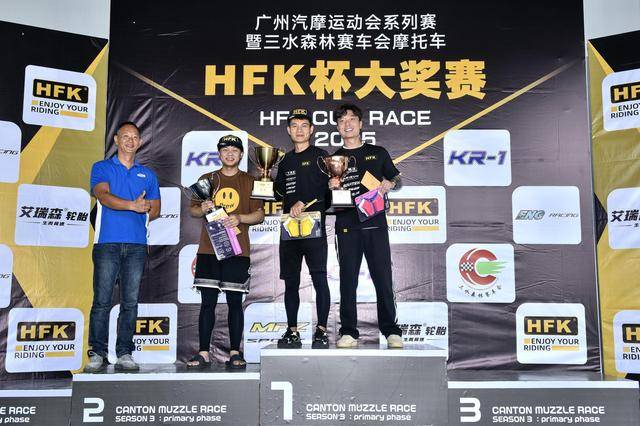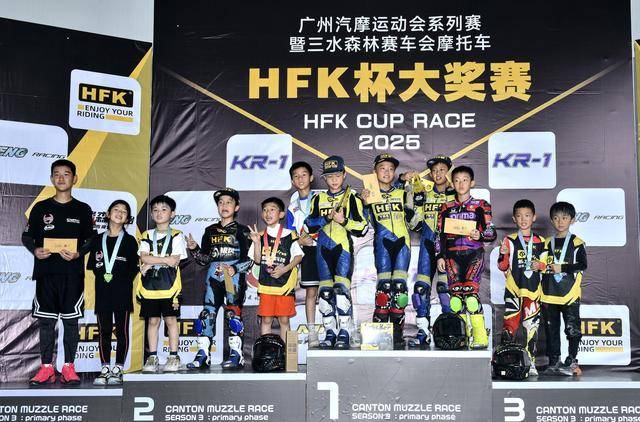 下面的圖片,廣州汽摩運動會系列賽暨三水森林賽車會摩托車 HFK 杯大獎賽 2025 第一站,各組別的成績和頒獎臺。