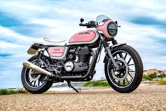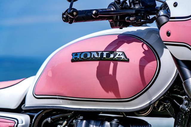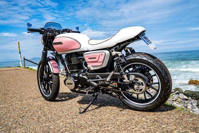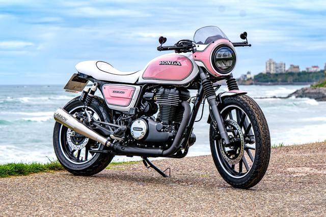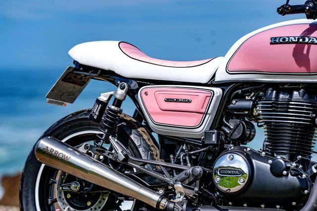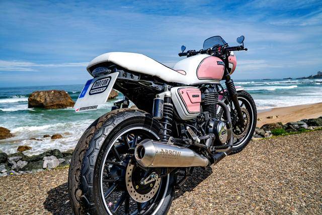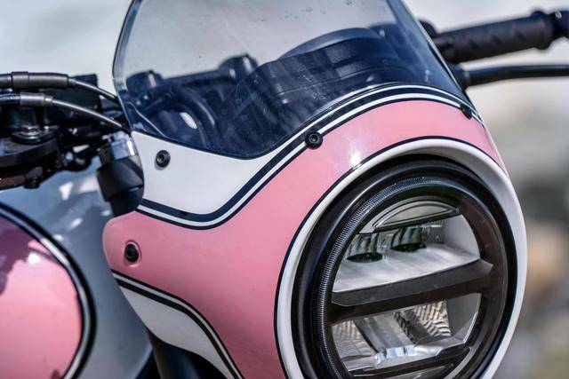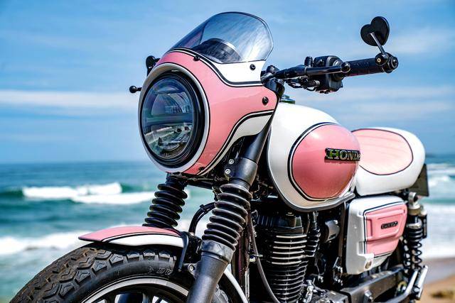 下面的圖片,是來自西班牙經銷商 Honda Motorsport Las Rozas 的 GB350S 定制車,作品名為米蘭達(Miranda),這也是本項目負責人七歲女兒的名字。此外,該作品也是由全女性的團隊設計,白色與糖果粉紅色的復古混合風格,很好地體現了其特點。其他的硬件上,作品換上了 Arrow 的排氣系統、YSS 的后減震,新的前大燈罩、心形外觀的后視鏡,以及白色 + 粉紅色面料的鞍座。