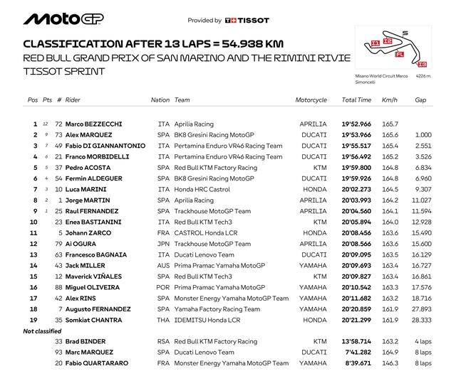 賽程為 13 圈的 Sprint沖刺賽,從排頭位出發的貝澤奇,發車之后就跑在了前面,上半段的比賽里,他與馬昆斯兄弟在前面的追逐、成為了全場的焦點;到第 6 圈,93 號車的馬昆斯(Marc Marquez)摔車退賽,剩下弟弟、小馬昆斯仍能對貝澤奇在 2025 賽季的首個沖刺賽冠軍構成威脅。