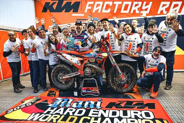 德國站的比賽結束后,萊騰比切勒已經拿到了足夠多的積分差距(166 分,積分榜第二名的博爾特只有 123 分),提前一站奪得了 FIM 極限耐力越野世界錦標賽 2025 賽季的世界冠軍(車手積分年度總冠軍) —— 這是他在該項比賽里的第五個世界冠軍頭銜。