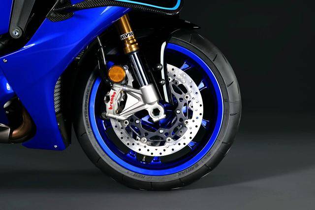 2026 YZF-R1M 與現(xiàn)行的 2025 款相同,在標(biāo)準(zhǔn)版的基礎(chǔ)上延伸而來(lái),換裝了Ohlins 奧林斯的電子輔助控制前后懸掛系統(tǒng),全碳纖維制的整流罩,車頭的上三星(前叉上三角臺(tái))處、帶有車輛編號(hào)的銘牌。此外,作為 WorldSBK 超級(jí)跑車世界錦標(biāo)賽、EWC 耐力世界錦標(biāo)賽等大賽里的比賽專用基礎(chǔ)車,YZF-R1M 沿用了 2024 老款車型的前剎車卡鉗(卡鉗允許改裝,換上更高規(guī)格的比賽級(jí)產(chǎn)品,原廠標(biāo)配的卡鉗、反正最終都是會(huì)被廢棄的)。