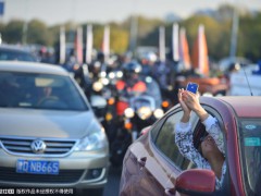 一位市民從車里伸出手機來拍攝萬圣節(jié)哈雷巡游車隊。