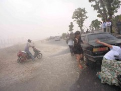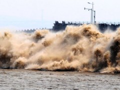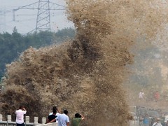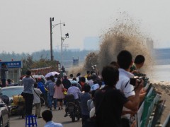 2012年9月18日,浙江省杭州市,農(nóng)歷八月初三,正值天文大潮。18日下午14時30分許,洶涌的錢江潮水沖上杭州下沙七格附近的江堤,巨浪瞬間打濕了多名觀潮游客。